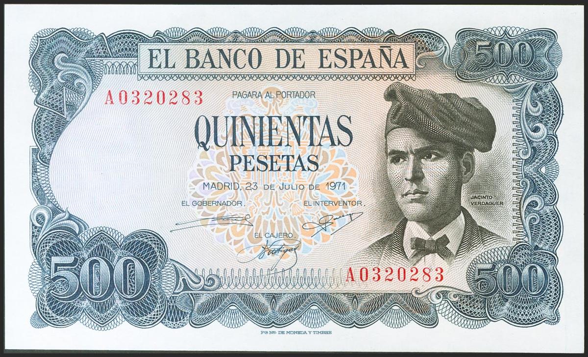 500 pesetas. July 23, 1971. Series A. (Edifil 2021: 473a). Original sizing. Uncirculated.
