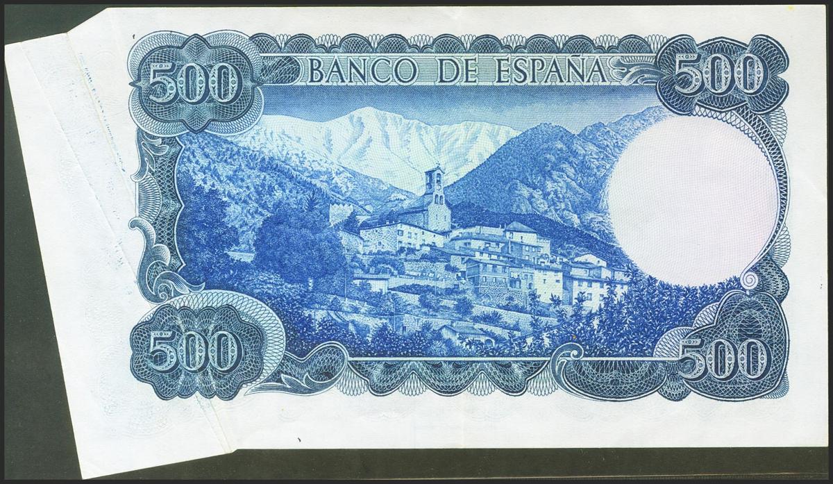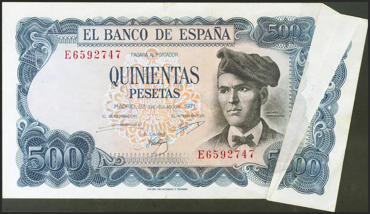 500 pesetas. July 23, 1971. Series E. Printing error causing a huge fold-bellows on the right side of the note. (Edifil 2021: 473a). Very rare, especially with this spectacularity. Almost Extremely Fine.