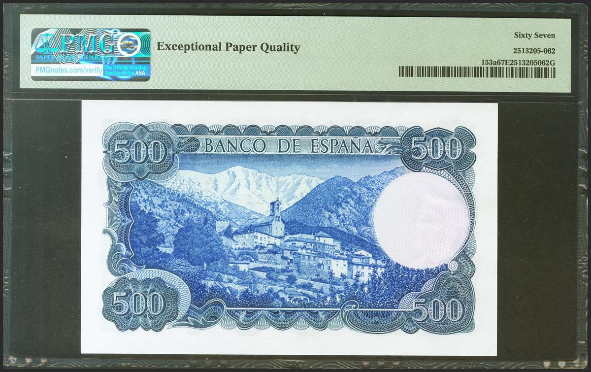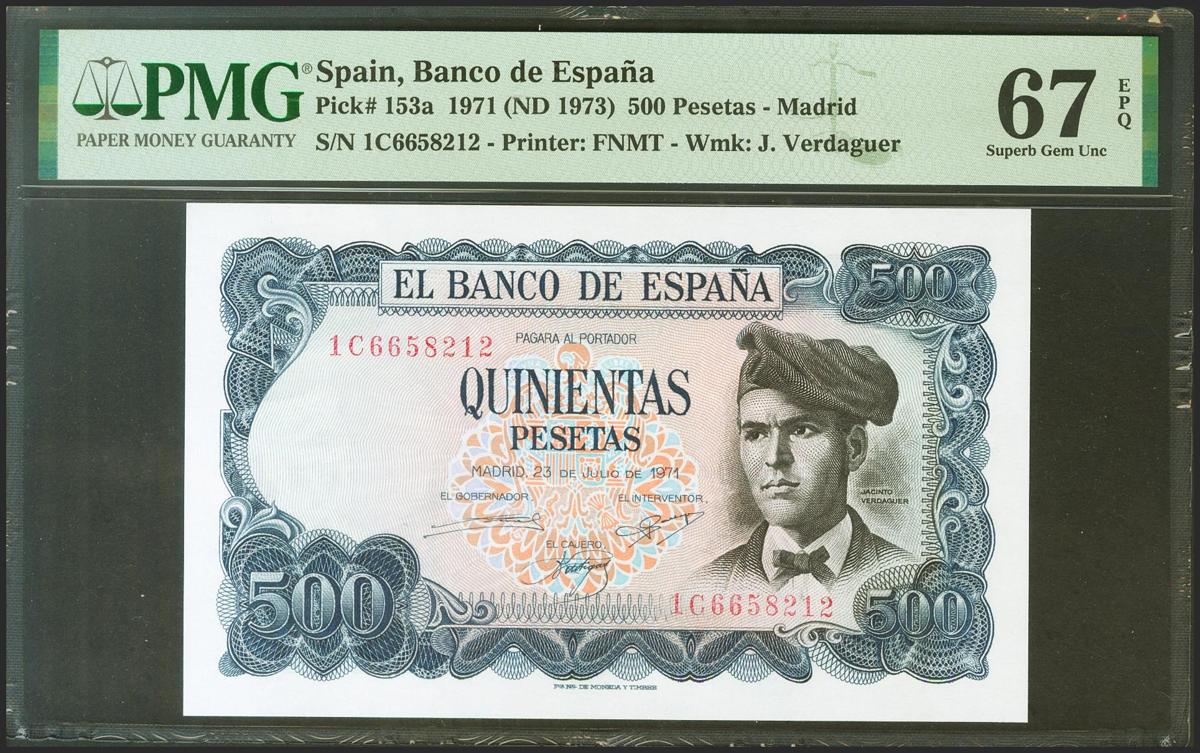 500 pesetas. July 23, 1971. Series 1C. (Edifil 2021: 473a, Pick: 153a). Rare in this exceptional quality. Uncirculated. PMG67EPQ package.