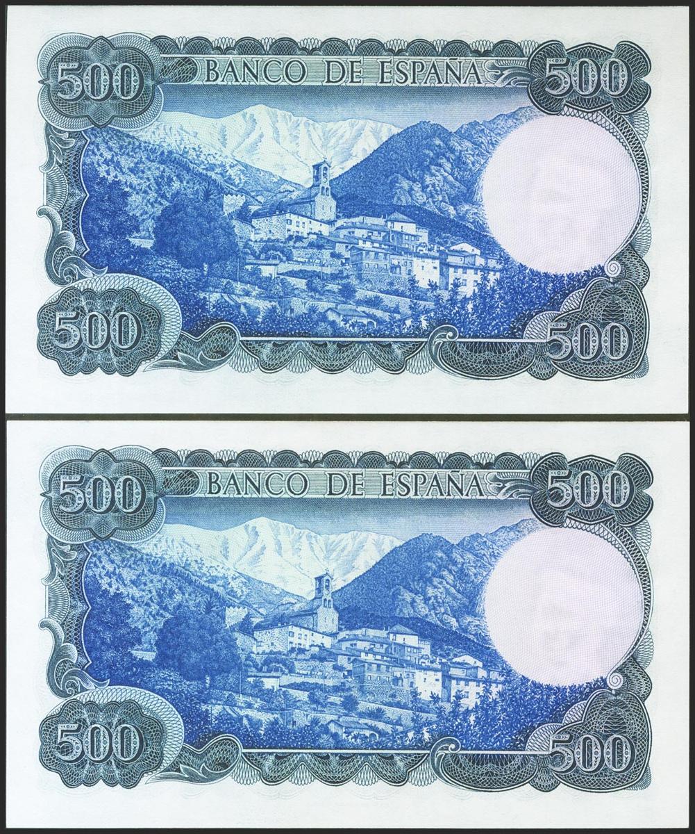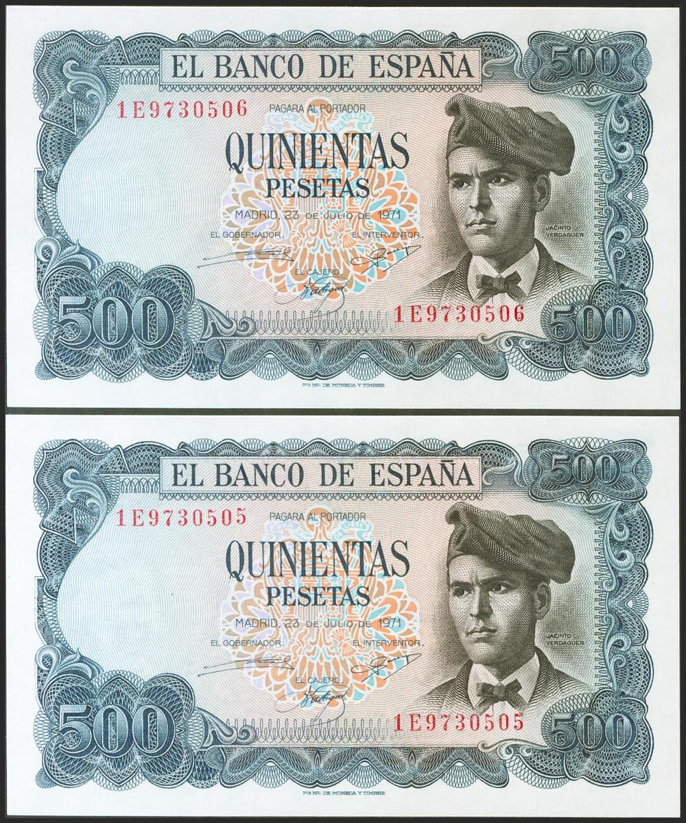 English 500 pesetas. July 23, 1971. Correlative couple. 1E series. (Edifil 2021: 473a). Original sizing. Almost Uncirculated.