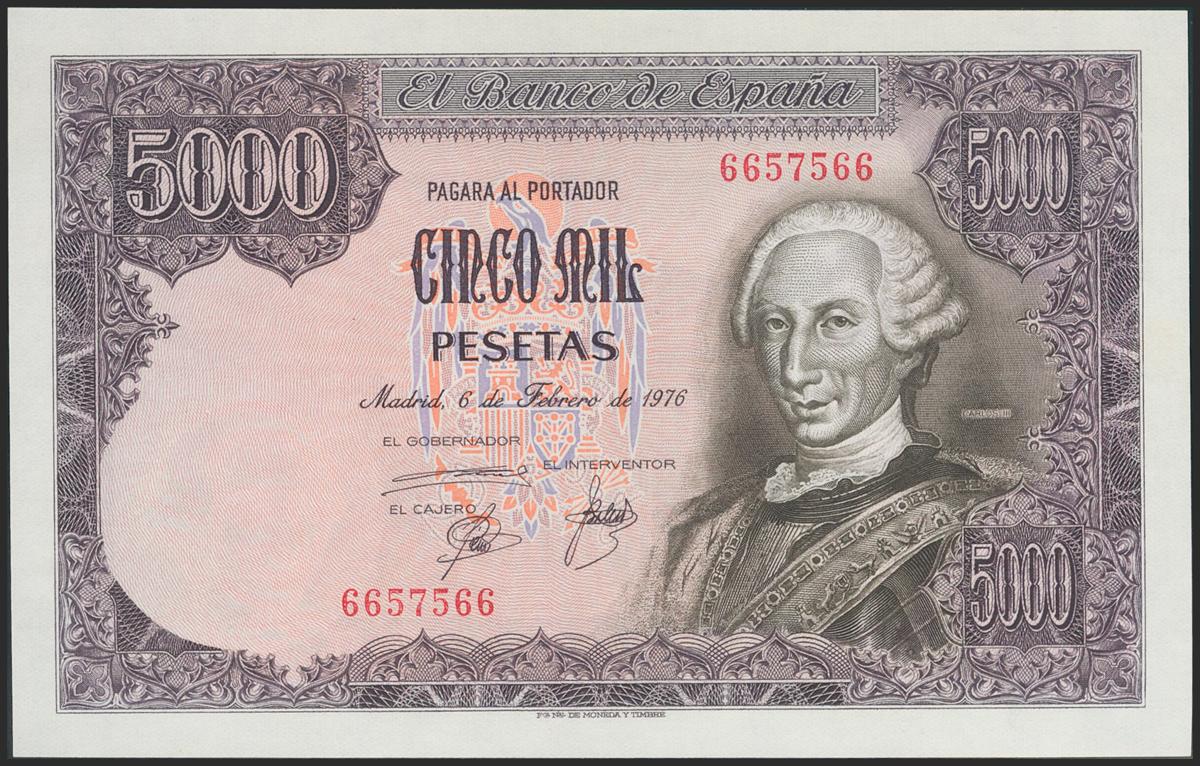 5000 Pesetas. February 6, 1976. Without series and capicúa numbering. (Edifil 2021: 475). Unusual. Uncirculated.
