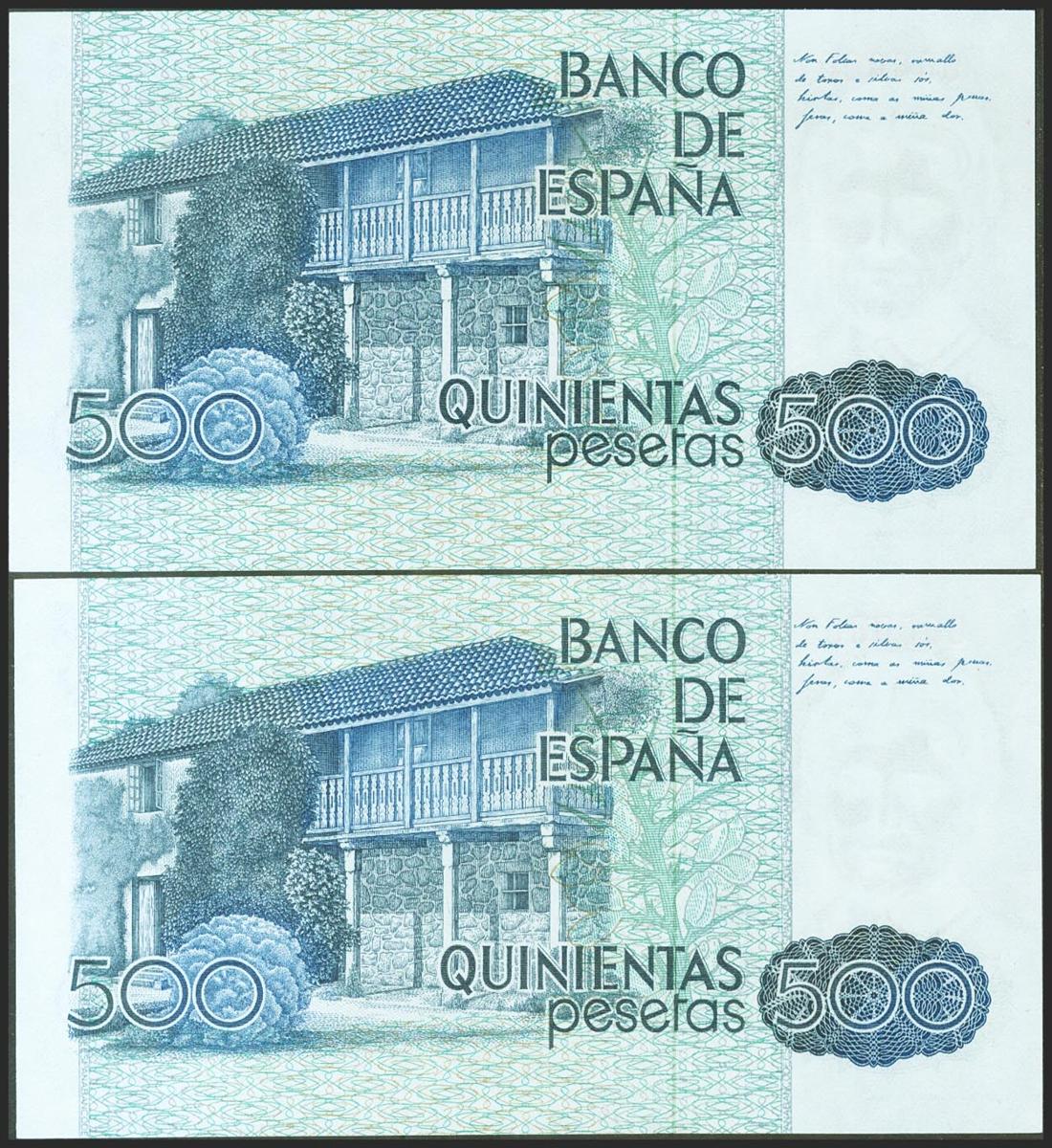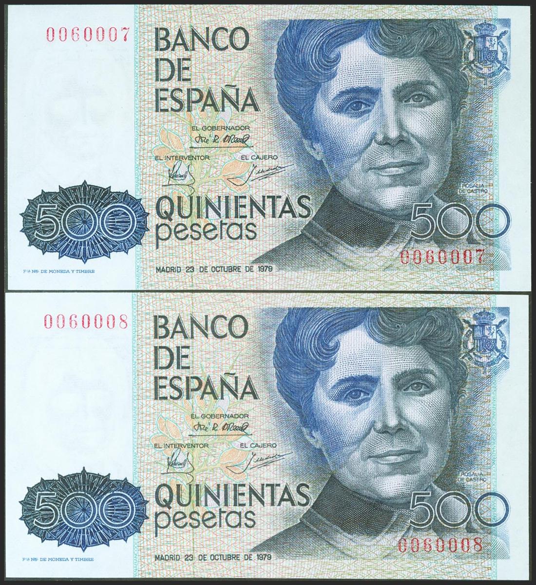 500 pesetas. October 23, 1979. Correlative couple. No series and low numbering. (Edifil 2021: 476). Uncirculated.