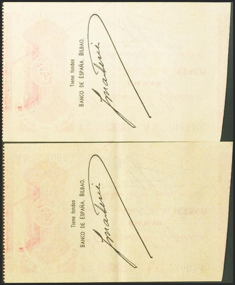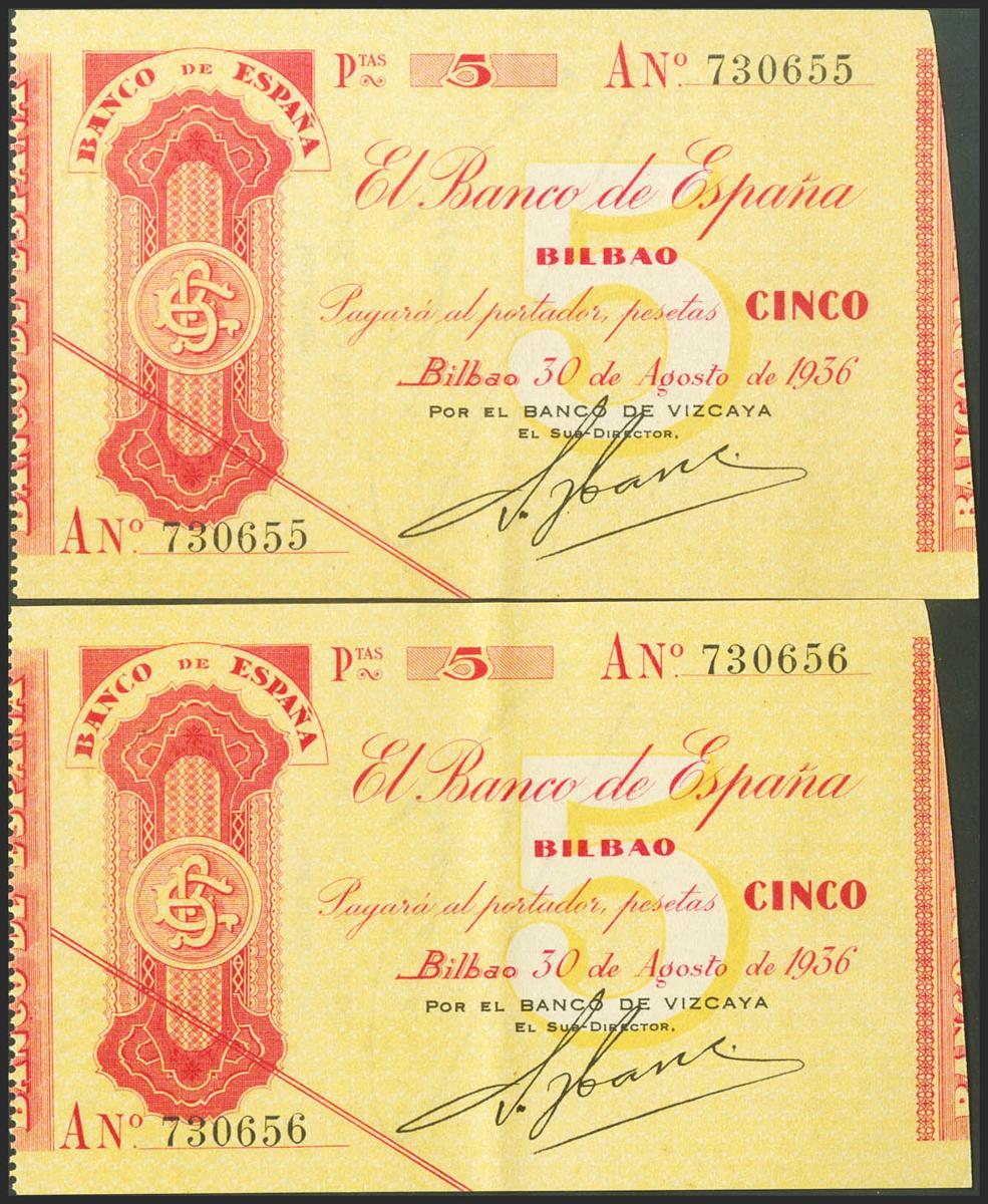 5 pesetas. August 30, 1936. Correlative couple. Bilbao branch, presigned by Banco de Vizcaya. Series A. (Edifil 2021: 368Aa). Unusual, original sizing. Good Extremely Fine.