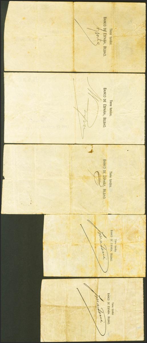 Complete series of 4 banknotes of 5 Pesetas, 25 Pesetas, 50 Pesetas and 100 Pesetas, in addition to the 5 Pesetas with series A, of checks issued from January 30, 1936 by the Bank of Spain in Bilbao (Edifil 2017: 368 , 368A, 369, 370, 371). Fine.