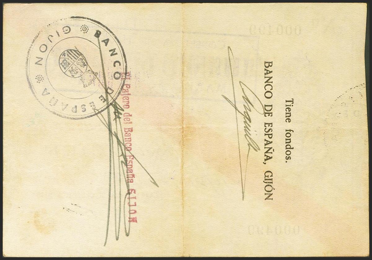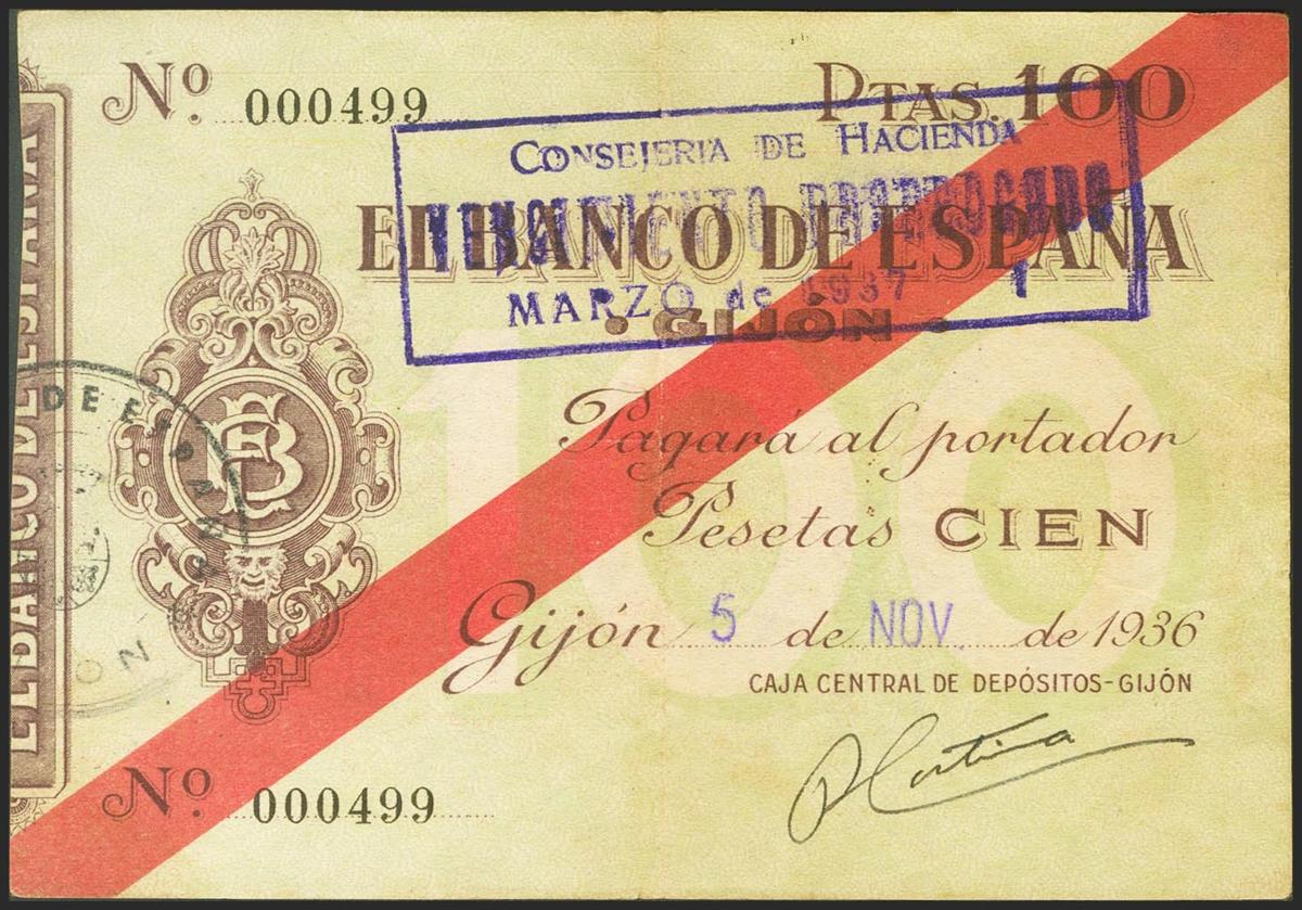 100 pesetas. November 5, 1936. Gijón branch. No series and very low numbering. (Edifil 2021: 384). Very rare, especially in this quality for this banknote, which is always in low qualities. Almost Extremely Fine.