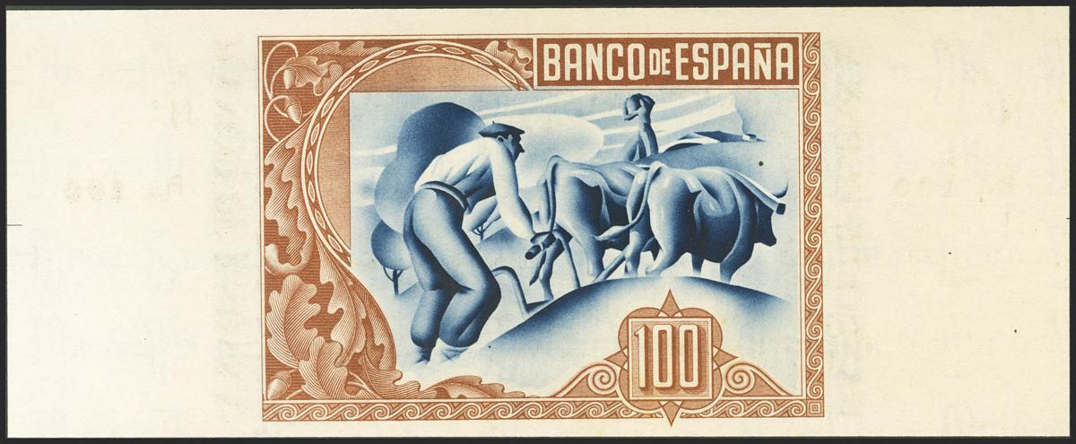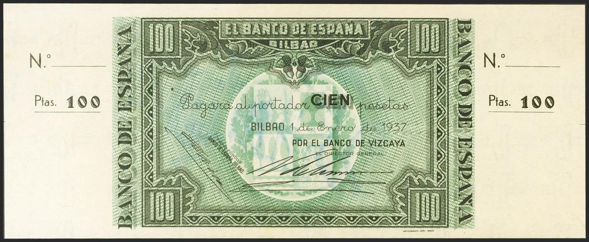 100 pesetas. January 1, 1937. Bilbao branch, presigned by Banco de Vizcaya. Without series and without numbering, with both matrices. (Edifil 2021: 390b). Original sizing. Uncirculated.