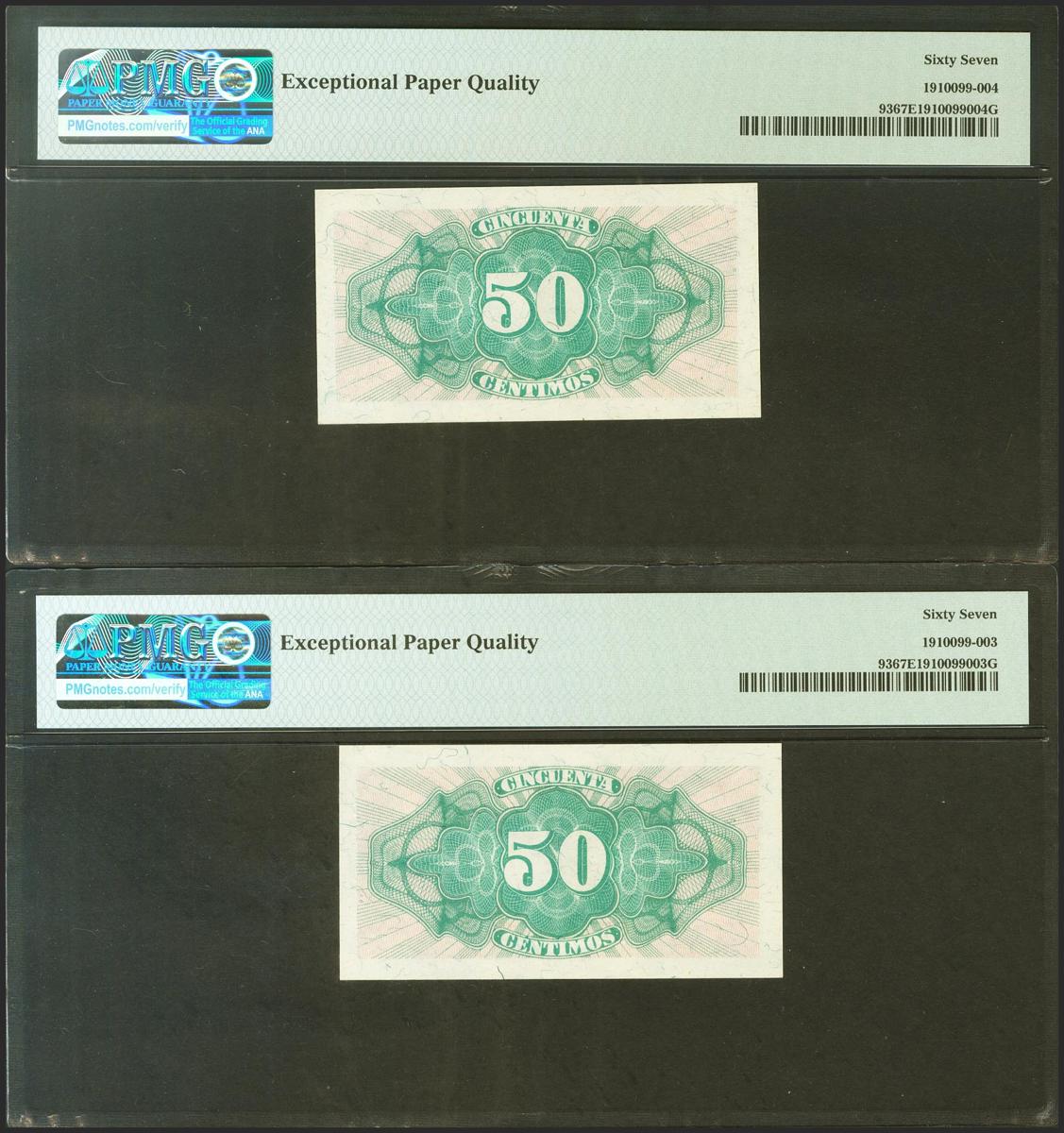 50 cents. 1937. Ministry of Finance. Correlative pair. Series C, last series issued. (Edifil 2021: 391a, Pick: 93). Rare in this conservation, original sizing. Uncirculated. PMG67EPQ packages, both.