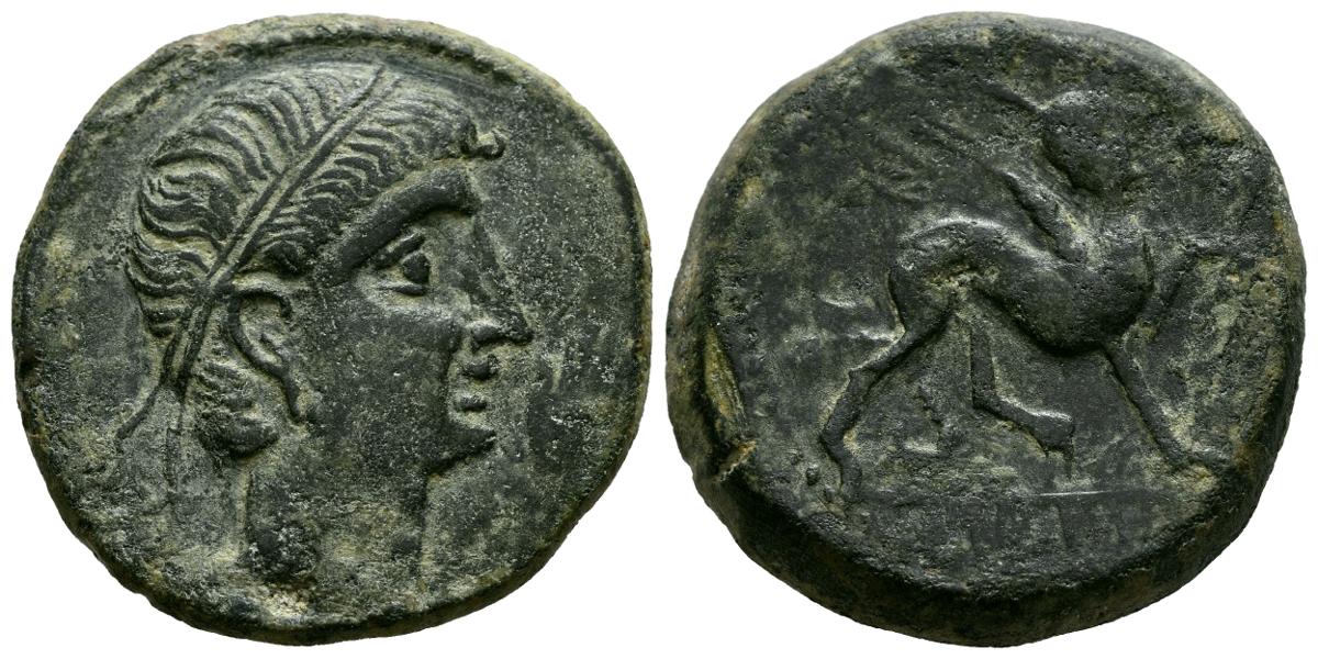 CASTULO (Cazlona, Jaen). As. (Ae. 15.32g/27mm). 180 BC (FAB-700). Obv: male diademed head right, hand in front. Rev: Sphinx to right, below Iberian legend: CASTELE. Good Very Fine/ Very Fine