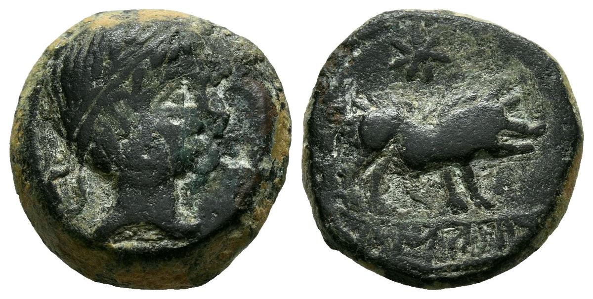 CASTULO (Cazlona, Jaen). Quadrant. (Ae. 3.69g/14mm). 180 BC (FAB-739). Obv: Laureate male head to right, Iberian letter in front. Rev: Boar to right, above star, below Iberian legend: CASTELE. Very Fine. Scarce copy.