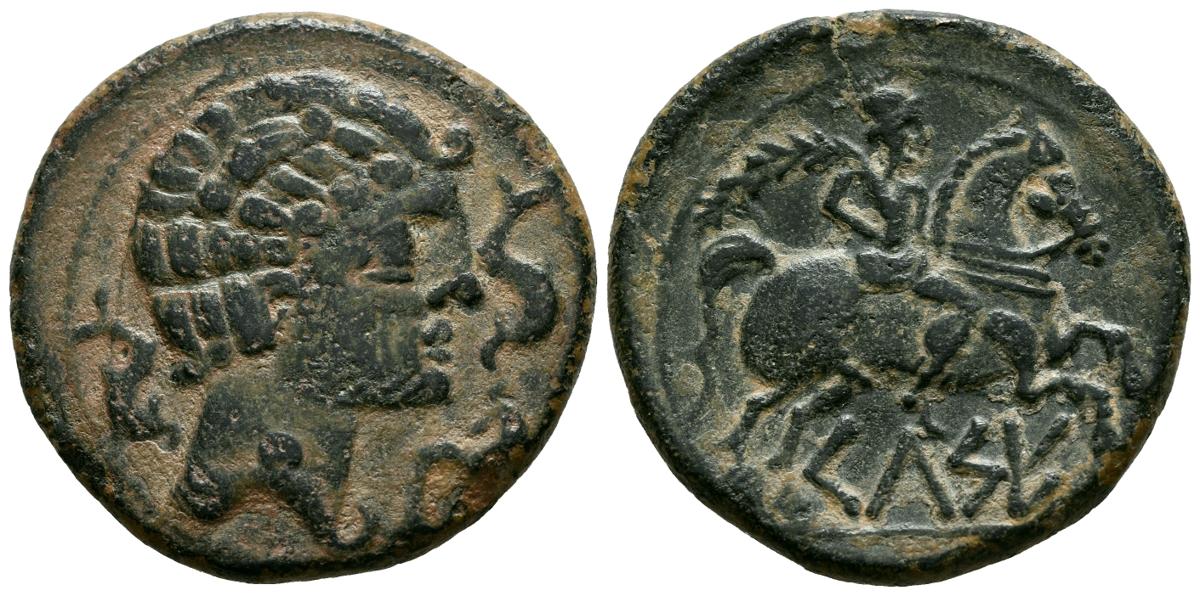 CELSE (Velilla del Ebro, Zaragoza). As. (Ae. 15.04g/30mm). 120-50 BC (FAB-771). Obv: Head right with mantle and fibula right, around three dolphins. Rev: Horseman with palm to right, below Iberian legend on line: CeLSE. Very Fine/ Good Very Fine.