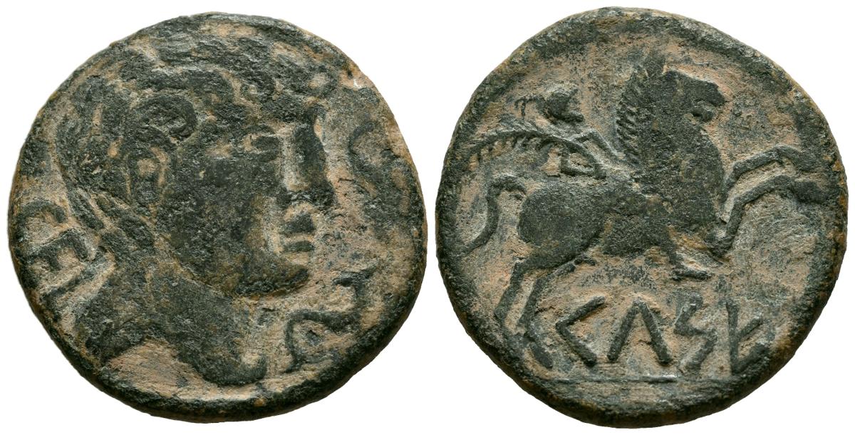 CELSE (Velilla del Ebro, Zaragoza). As. (Ae. 16.64g/31mm). 120-50 BC (FAB-773). Obv: Male head right, behind legend: CEL, before two dolphins. Rev: Horseman with palm to right, below Iberian legend: CeLSE. Almost Very Fine.