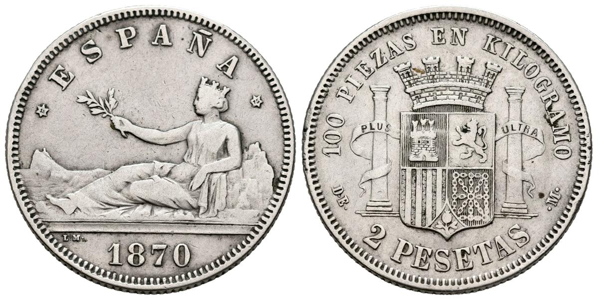 PROVISIONAL GOVERNMENT (1868-1871). 2 pesetas. (Ar. 9.91g/27mm). 1870 *18-75. Madrid DEM. (Cal-2019-33). Very Fine.