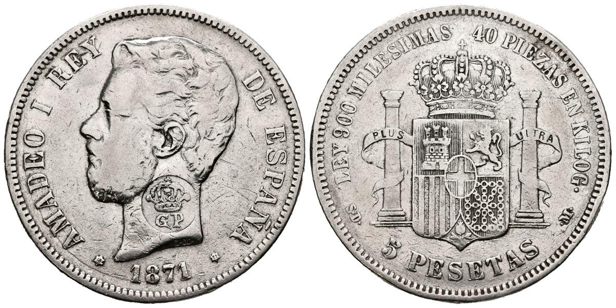 AMADEO I (1871-1873). 5 pesetas. (Ar. 24.86g/38mm). 1871 *18-71. Madrid SDM. (Cal-2019-1). Almost Very Fine. polished. GP Countermark to circulate in the Azores.