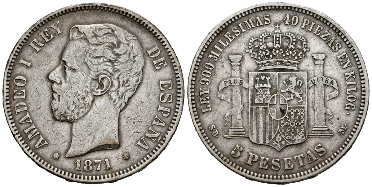 AMADEO I (1871-1873). 5 Pesetas (Ar. 24.77g/37mm). 1871 *18-18. Madrid SDM. (Cal-2019-2). Almost Very Fine. Weird.
