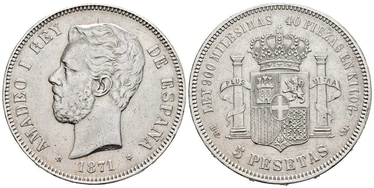 AMADEO I (1871-1873). 5 pesetas. (Ar. 25.02g/37mm). 1871 *18-74. Madrid DEM. (Cal-2019-5). Minted under the First Republic. Good Very Fine.