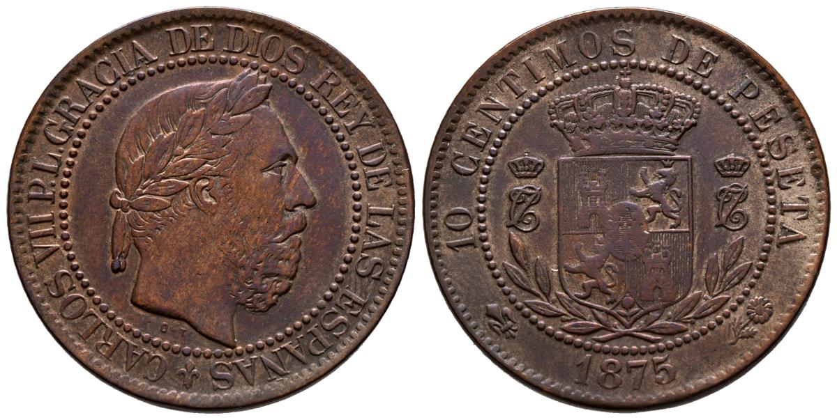 CARLOS VII (1868-1909). 10 cents. (Ae. 10.11g/30mm). 1875. Onate. (Cal-2019-5). Good Very Fine. Beautiful patina. Good copy.