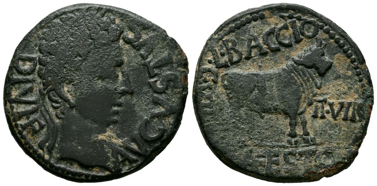 CELSE (Velilla de Ebro, Zaragoza). Ace (Ae. 13.39g/31mm). 27 BC-14 AD (FAB-809). Obv: Laureate head of Augustus right, around legend: AVGVSTVS DIVI F. Rev: Bull right, around legend: L BACCIO MN FESTO C VI CEL II VIR. Almost Very Fine.