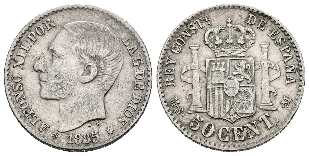 ALFONSO XII (1874-1885). 50 cents. (Ar. 2.51g/18mm). 1885 *8-6. MadridMSM. Posthumous coinage. (Cal-2019-14). Good Very Fine.