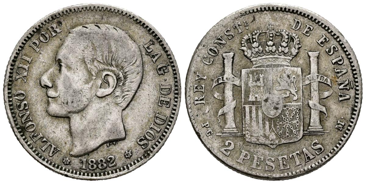 English ALFONSO XII (1874-1885). 2 pesetas. (Ar. 10.43g/27mm). 1882 *18-91. Madrid PGM. False vintage. Mismatched testers. Impossible dates. Almost Very Fine