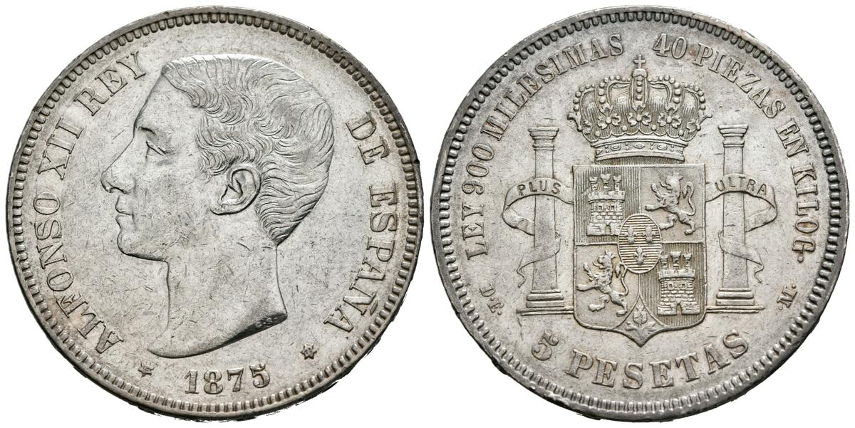 ALFONSO XII (1874-1885). 5 pesetas. (Ar. 24.90g/37mm). 1875 *18-75. Madrid DEM. (Cal-2019-35). Good Very Fine. Little marks.