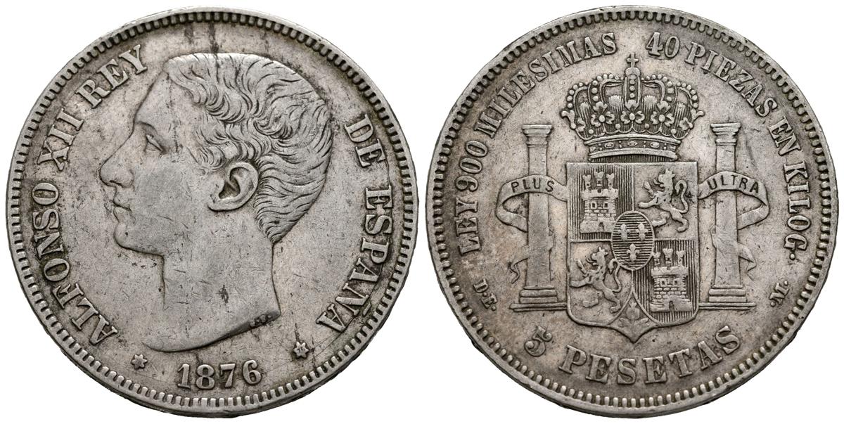 ALFONSO XII (1874-1885). 5 pesetas. (Ar. 24.72g/37mm). 1876 *18-76. Madrid DEM. (Cal-2019-37). Very Fine. Scratch.