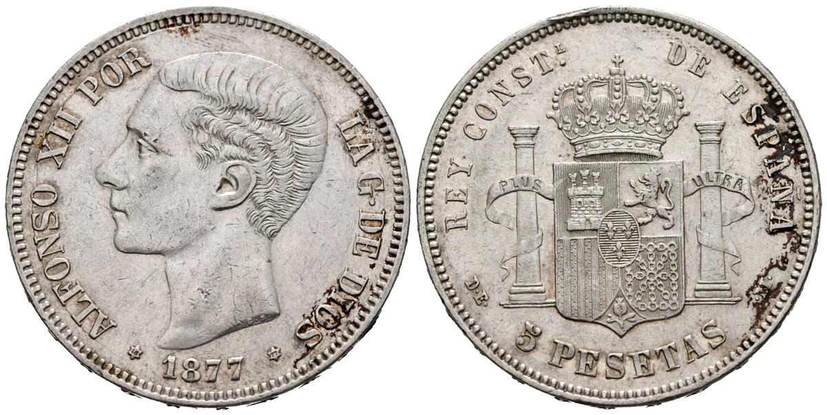 ALFONSO XII (1874-1885). 5 pesetas. (Ar. 25.06g/37mm). 1877 *18-77. Madrid DEM. (Cal-2019-38). Very Fine.
