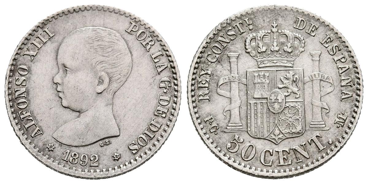 English ALFONSO XIII (1885-1931). 50 Cents (Ar. 2.45g/18mm). 1892/82 *92. Madrid PGM. (Cal-2019-28). Good Very Fine. Cleaning Scratch .