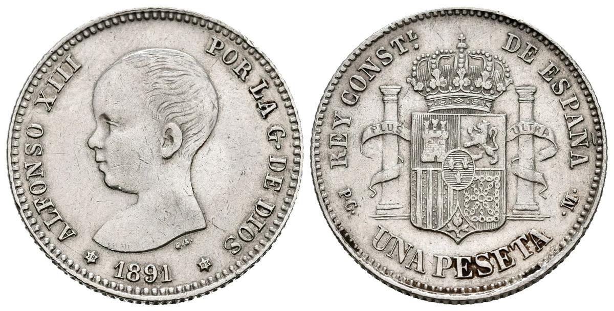 ALFONSO XIII (1885-1931). 1 Peseta. (Ar. 4.99g/23mm). 1891 *18-91. Madrid PGM. (Cal-2019-53). Good Very Fine. cleaned.