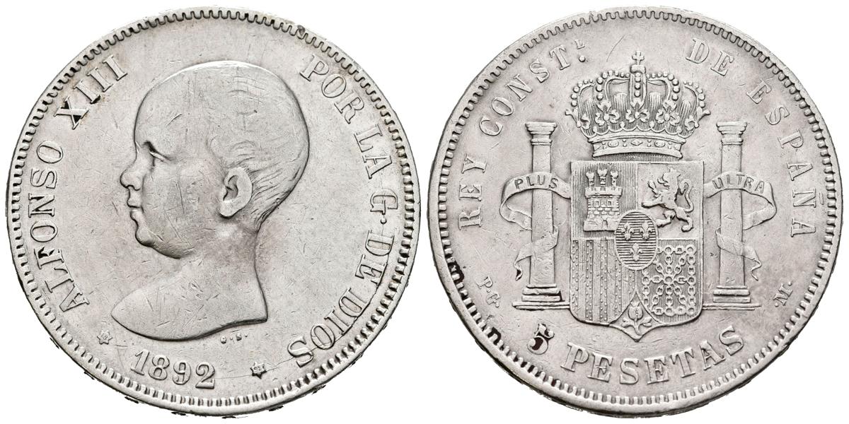 ALFONSO XIII (1885-1931). 5 pesetas. (Ar. 25.24g/37mm). 1892 *18-92. Madrid PGM. (Cal-2019-99). Very Fine/ Good Very Fine.