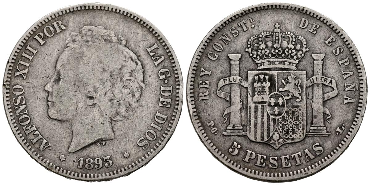 ALFONSO XIII (1885-1931). 5 pesetas. (Ar. 24.61g/37mm). 1893 *18-93. Madrid PGL. (Cal-2019-103var). scratched ear Good Fine.