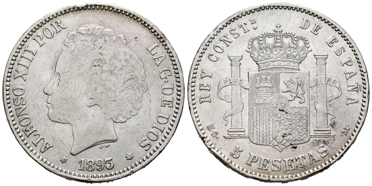 ALFONSO XIII (1885-1931). 5 pesetas. (Ar. 24.65g /37mm). 1893 *18-93. MadridMSM. False vintage. Mismatched testers. Almost Very Fine/ Very Fine.