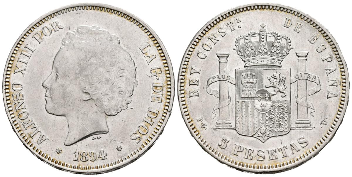 ALFONSO XIII (1885-1931). 5 pesetas. (Ar. 25.02g/37mm). 1894. *18-94. Madrid. PGV. (Cal-2019-104). Almost Extremely Fine. Little marks.