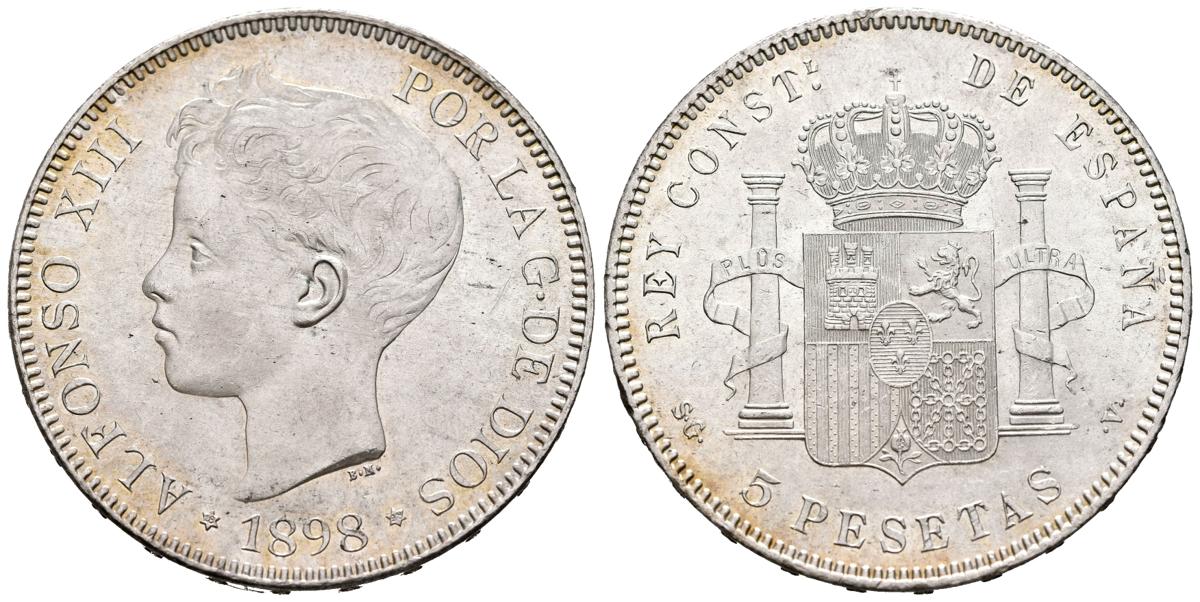 ALFONSO XIII (1885-1931). 5 pesetas. (Ar. 24.87g/37mm). 1898*18-98. Madrid SGV. (Cal-2019-109). Almost Uncirculated. Original Luster . Beautiful specimen.