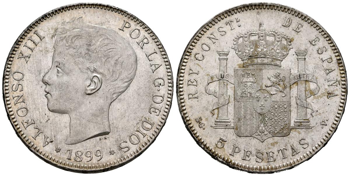 ALFONSO XIII (1885-1931). 5 pesetas. (Ar. 24.89g/37mm). 1899 *18-99. Madrid SGV. (Cal-2019-110). Almost Uncirculated. Original Luster .