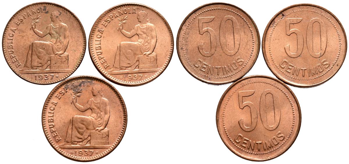 II REPUBLIC (1931-1939). Nice set consisting of 3 50 cent coins from 1937 (*34 and 36). Madrid. Uncirculated.