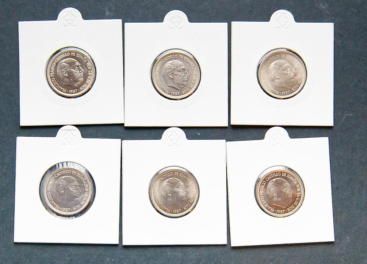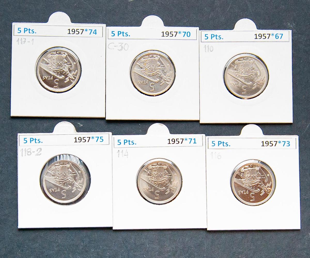 SPANISH STATE (1936-1975). Set of 6 5 Pesetas coins from 1957 (*67,70,71,73,74 and 75). All Uncirculated parts. TO EXAMINE.