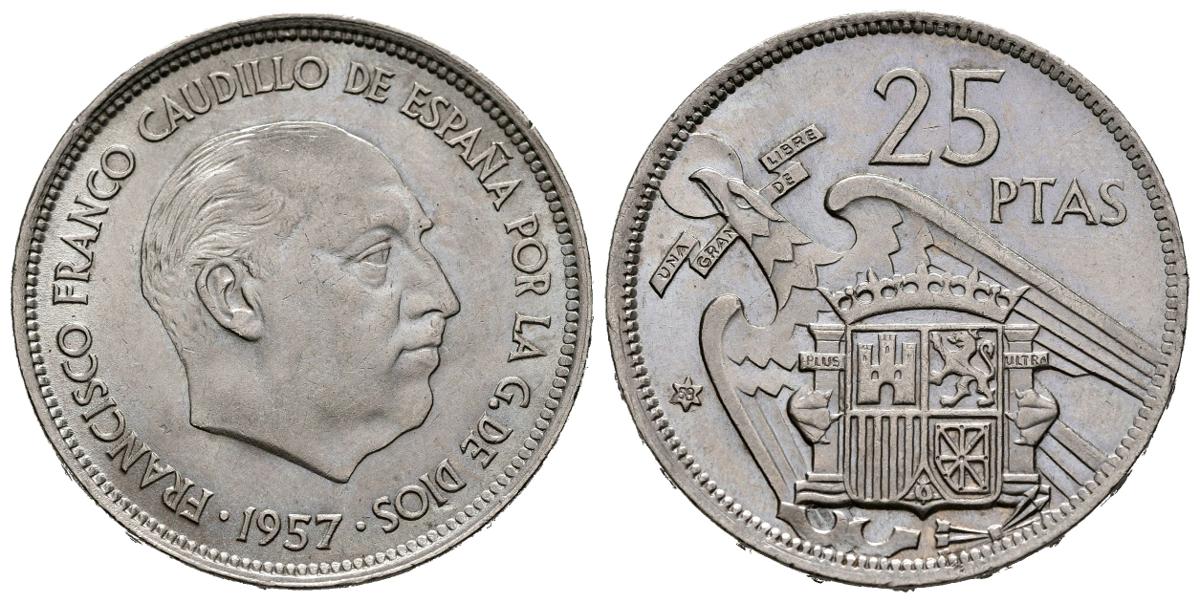 SPANISH STATE (1936-1975). 25 pesetas. (Ni. 8.44g/27mm). 1957 *58. Madrid. (Cal-2019-116). Almost Uncirculated. nice tone Limited.