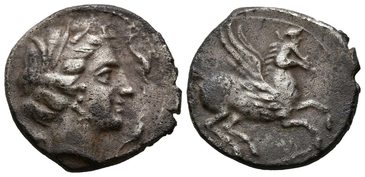 EMPORION (Ampurias, Girona). Drachm. (Ar. 5.00g/20mm). 180-100 BC (FAB-1135). Obv: Female head right, around three dolphins. Rev: Pegasus right, below without legend. Very Fine. Scarce copy. Former Aureo & Calicó 267, 04/22/2015, Lot No. 2084.
