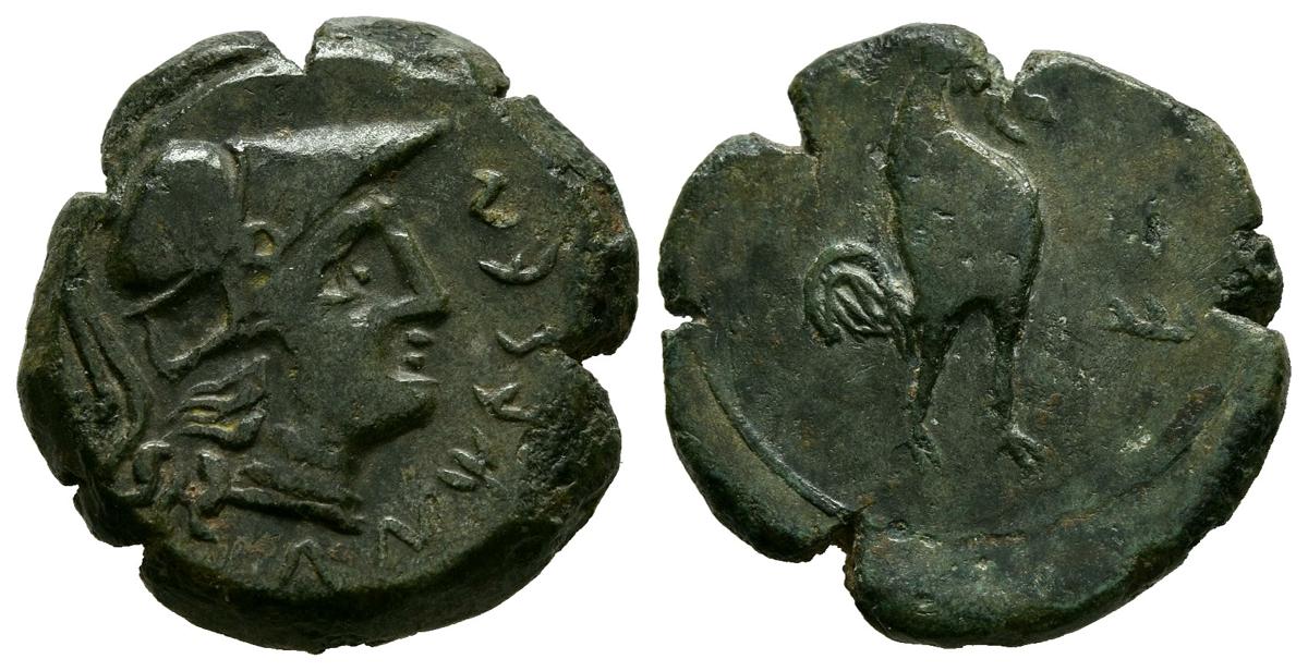 UNTICESCEN (Ampurias, Girona). Quadrant. (Ae. 4.62g/18mm). 130-90 BC (FAB-1240). Obv: Head of Pallas right, before Iberian legend: UNTiCeSCeN. Rev: standing rooster to the right, Iberian letter in front: E-. Good Very Fine. Off-center reverse. Rare specimen, and more so. Green patina.