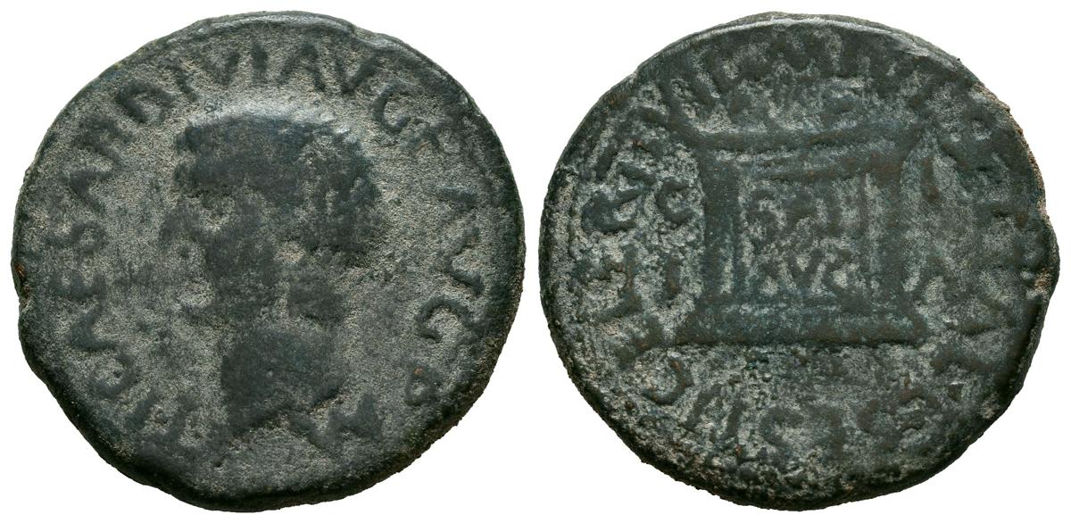 ILICI (Elche, Alicante). Semis. (Ae. 6.96g/22mm). AD 14-36 (FAB-1526). Obv: Head of Tiberius left, around legend: TI CAESAR DIVI AVG F AVGVSTVS P M. Rev: Ara with inscription: SAL AVG, on both sides: CI/IA, around legend: M IVL SETTAL L SESTI CELER II VIR. Almost Very Fine.
