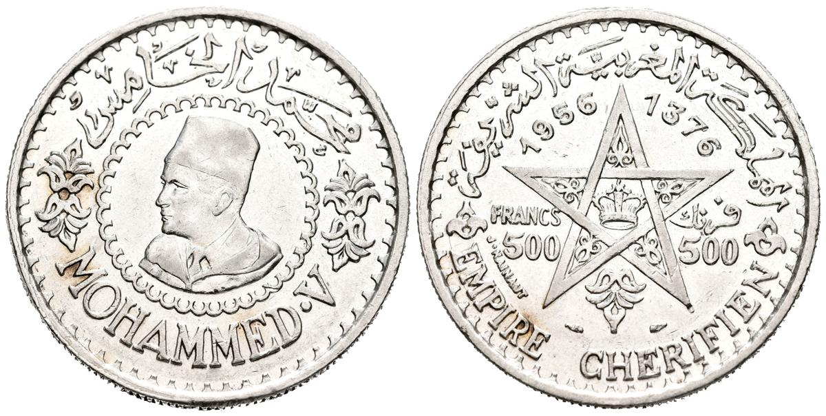 English MOROCCO. 500 Francs. (Ar. 22.50g/36mm). 1956 (1376H). Mohammed V. (Km#54). Almost Extremely Fine.