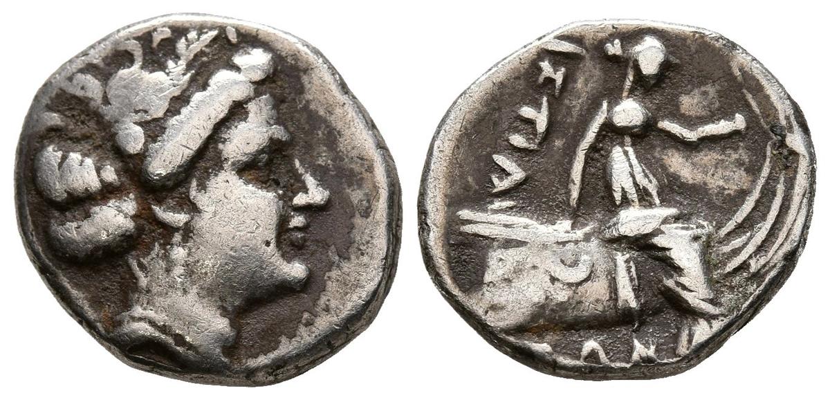 HISTAIA, Euboia. Tetrobolus. (Ar. 2.38g/15mm). 3rd century-1st century BC (HGC 4, 1524). Obv: diademed female head right. Rev: Histaia seated on bow to right, behind Greek legend. Good Very Fine.