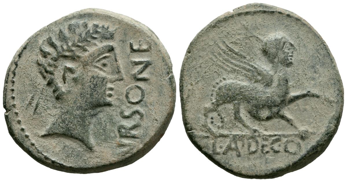 URSONE (Osuna, Sevilla). As. (Ae. 14.86g/29mm). 50 BC (FAB-2498). Obv: Diademed male head right, in front legend: VRSONE. Rev: Sphinx to right, above S, below line legend: L AP DEC Q F. Almost Extremely Fine/ Good Very Fine. Nice specimen, rare like this.