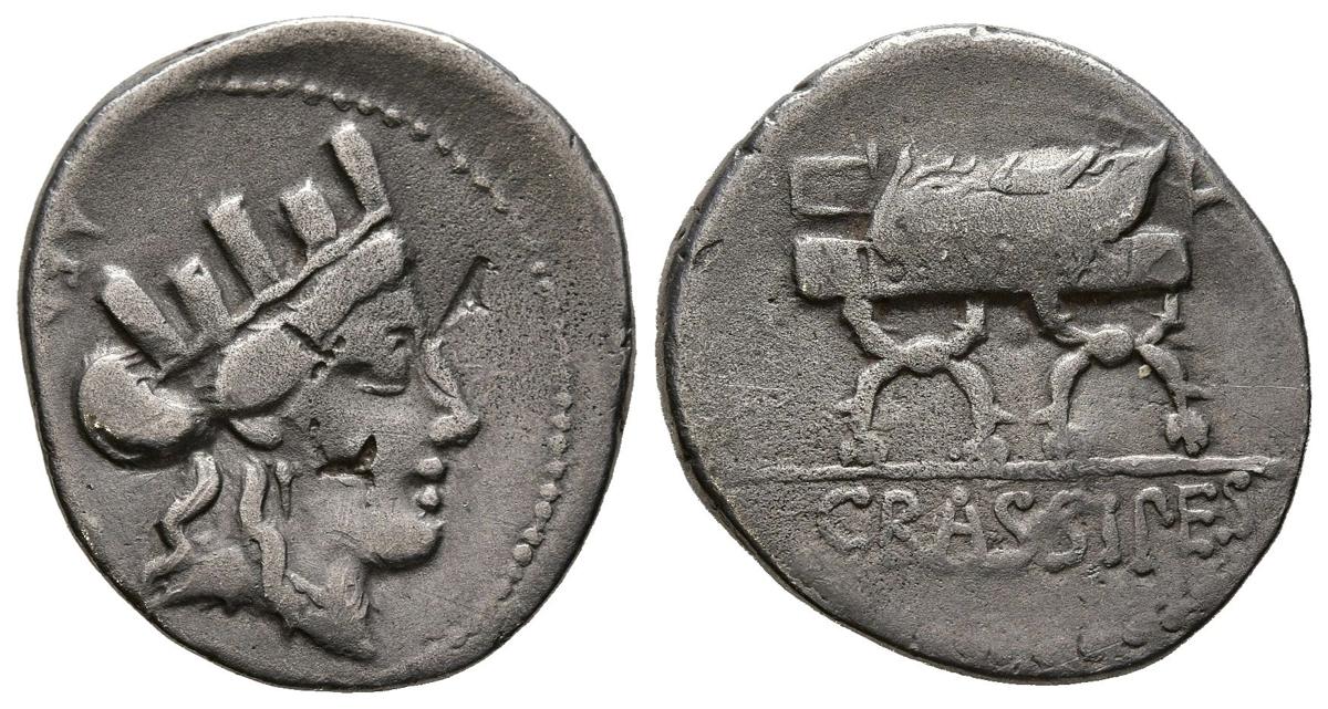 GENS FURY. Denarius. (Ar. 3.23g/19mm). 84 BC Auxiliary workshop of Rome. (Crawford 356/1c; FFC 732). Obv: Female head with mural crown right, behind legend: AED CVR. Rev: Curule chair with inscription: P FOVRIVS, below legend: CRASSIPIES. Almost Very Fine. Countermark on obverse.