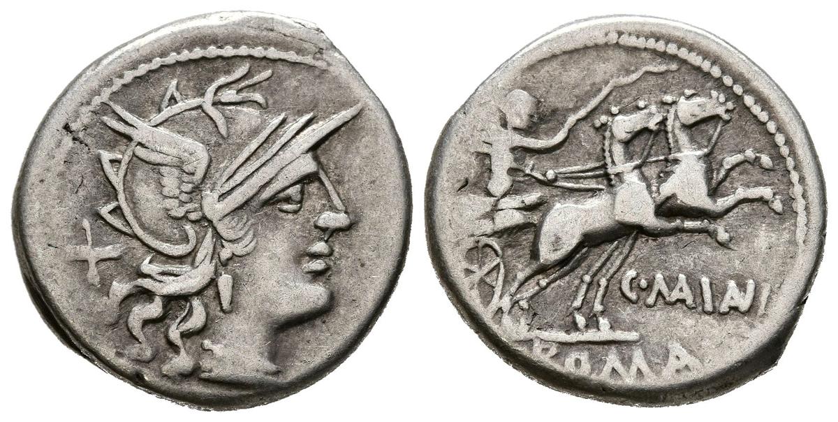 GENS MORNING. Denarius. (Ar. 3.71g/18mm). 153 BC Rome. (FFC 832; Crawford 203/1a). Obv: Head of Rome right, behind X. Rev: Victory with whip on beam right, below legend: C MAIANI, in exergue: ROMA. Very Fine.