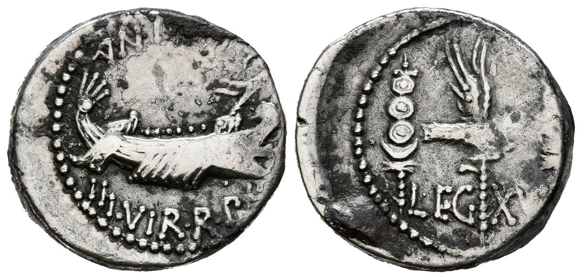 MARK ANTONY. Denarius. (Ar. 3.42g/18mm). (FFC 50; Crawford 544/30). Obv: Praetorian galley right, around legend: ANT AVG III VIR RPC. Rev: Legionary eagle between two military insignia, including legend: LEG XV. Very Fine.