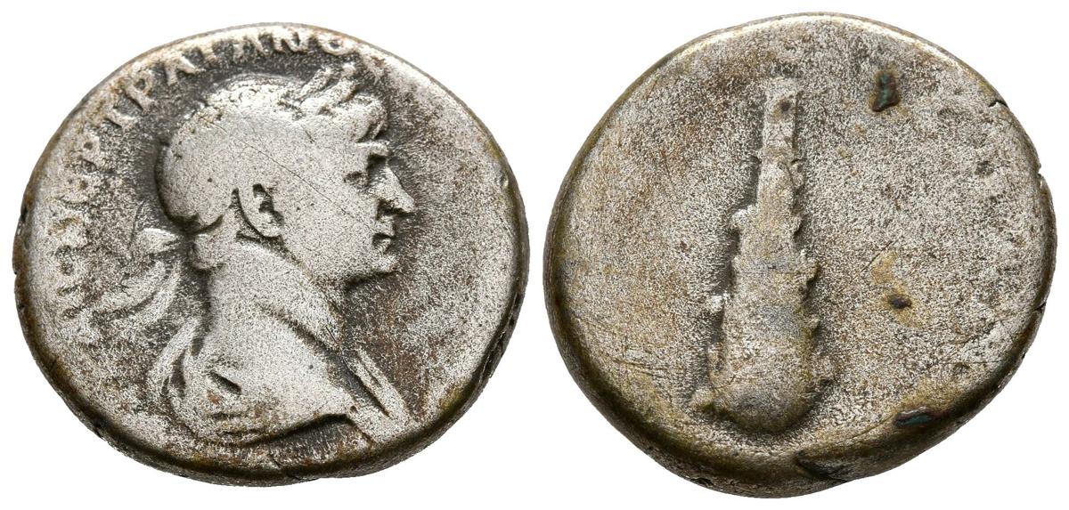 TRAJAN. Didrachm. (Ar. 6.29g/21mm). 98-117 AD Cappadocia. (RPC 3000). Obv: Laureate and draped bust of Trajan right, around Greek legend. Rev: Mallet down, around Greek legend. Good Fine.