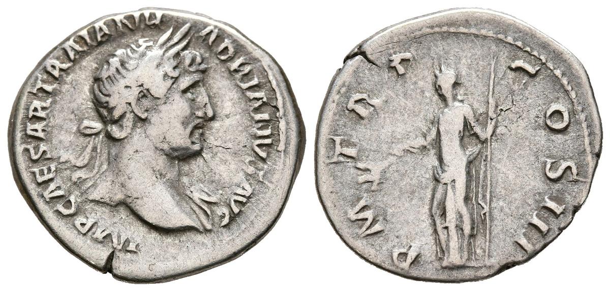 HADRIAN. Denarius. (Ar. 3.32g/20mm). 119-120 AD Rome. (RIC 225). Obv: Laureate bust of Hadrian right with draping over left shoulder, around legend: IMP CAESAR TRAIAN HADRIANVS AVG. Rev: Pax standing left holding branch and scepter, around legend: PM TR P COS III. Very Fine. Scarce.