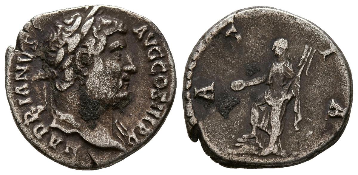 HADRIAN. Denarius. (Ar. 2.99g/17mm). 130-133 AD Rome. (RIC 1506). Obv: Laureate head of Hadrian right, around legend: HADRIANVS AVG COS III P P. Rev: Asia standing left with foot on prow carrying hook and rudder, around legend: ASIA. Almost Very Fine. Scarce copy.