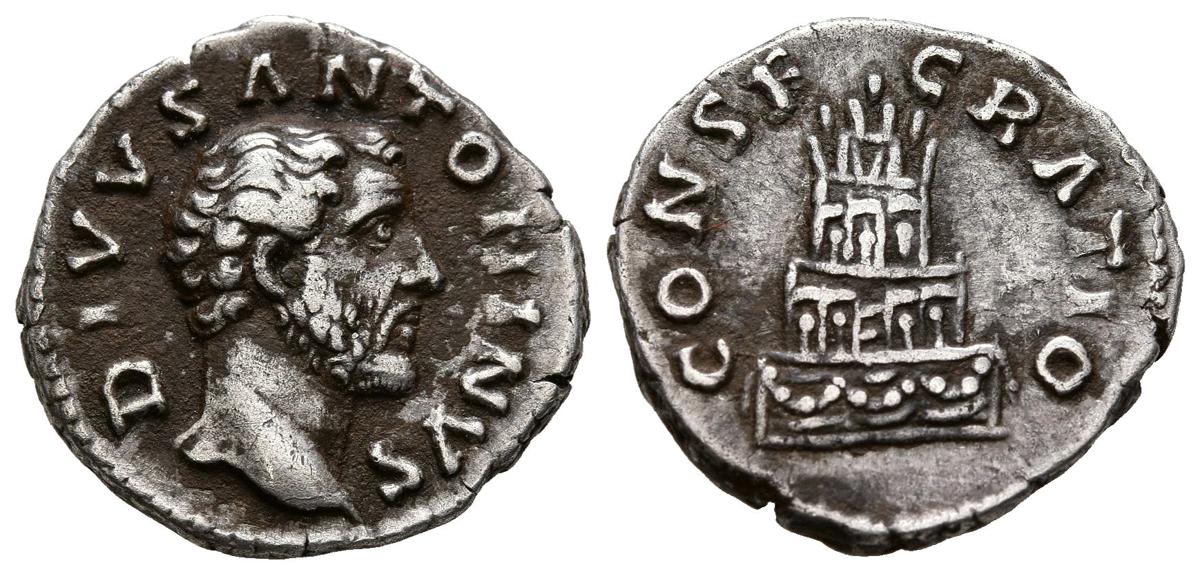 DIVO ANTONINO PIO. Denarius. (Ar. 3.43g/18mm). 161 AD Rome. (RIC 436). Obv: Head of Antoninus Pius right, around legend: DIVVS ANTONINVS. Rev: Funeral pyre on four decorated stairs with four levels, around legend: CONSECRATIO. Very Fine.